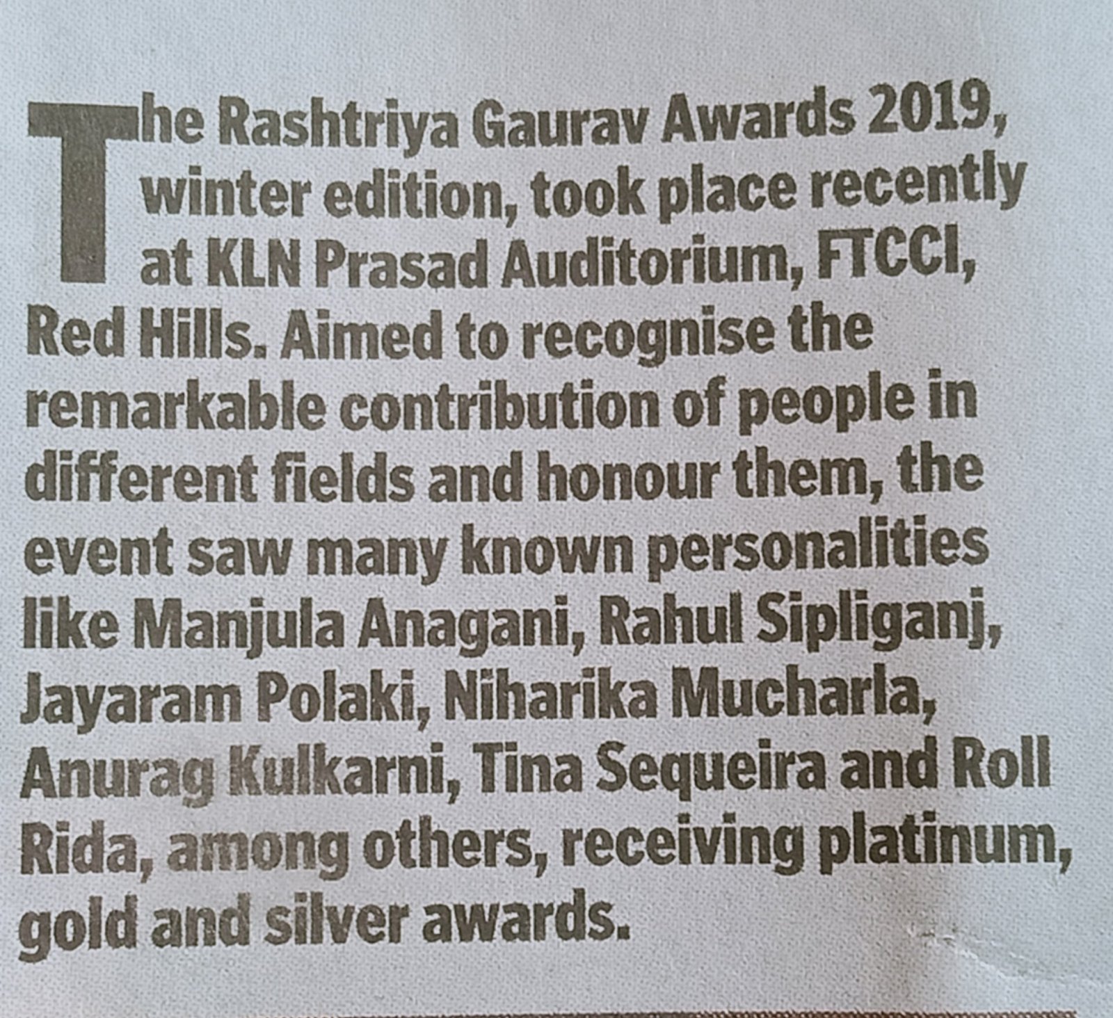 Recipient of the prestigious Rashtriya Gaurav Award (2019) in association with the Government of Telangana.