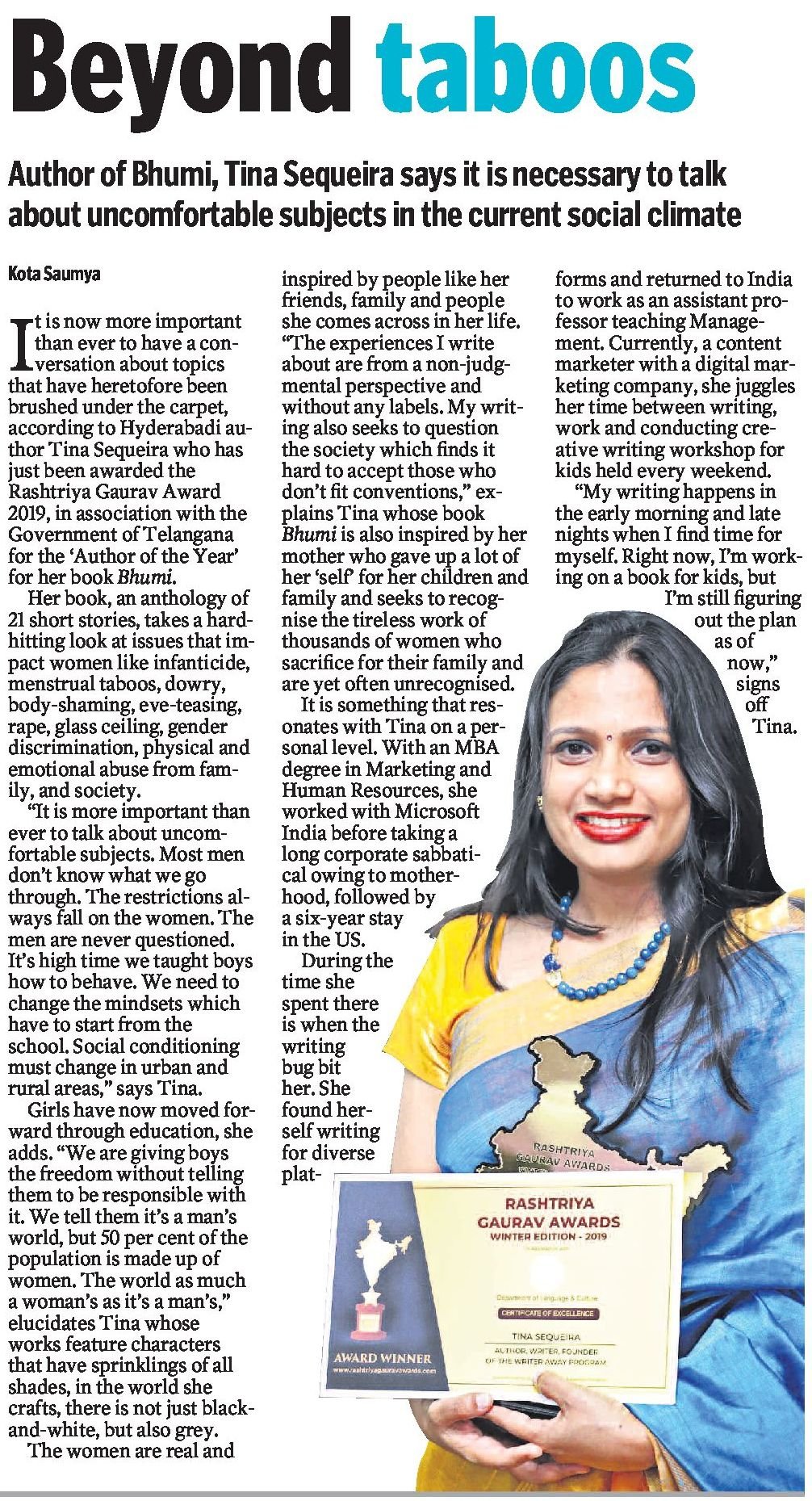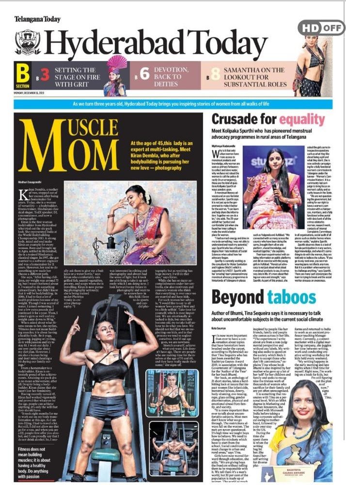Tina Sequeira’s interview was covered in the front page of the Telangana Today’s 3rd Anniversary issue, which featured women achievers from the Telangana State. Tina featured alongside Spurthi Kolipaka, social activist and Founder of WomComMatters and Kiran Dembla, a body building champion, and fitness trainer to celebrities such as S.S. Rajamouli, Anushka Shetty, and Tamannaah.