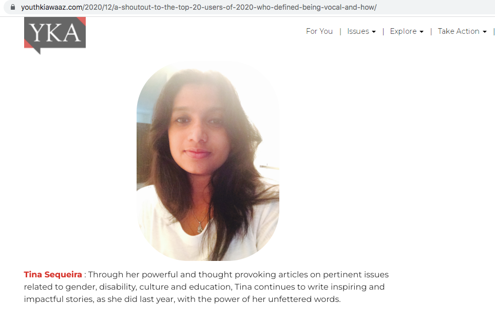 Listed in the Top 20 writers of 2020 by YouthKiAwaaz, India’s leading media publication for Social Justice. Writers are listed in an alphabetical order.