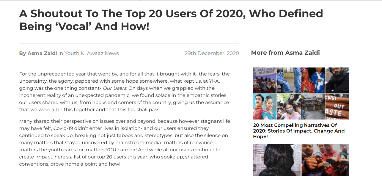 Listed In The ‘Top Writers of 2020’ by Youth Ki Awaaz