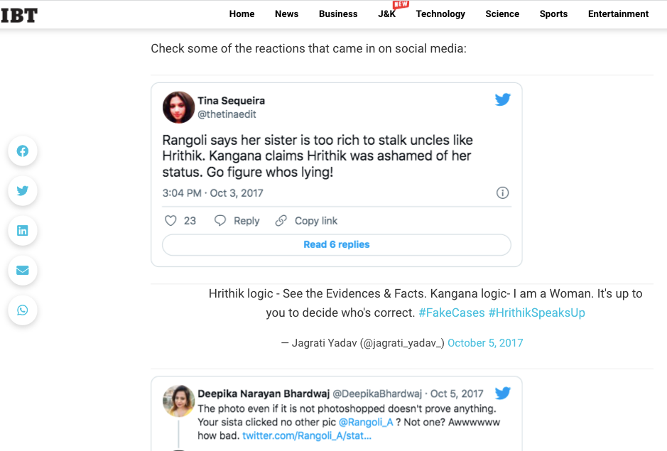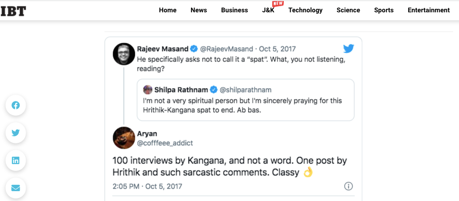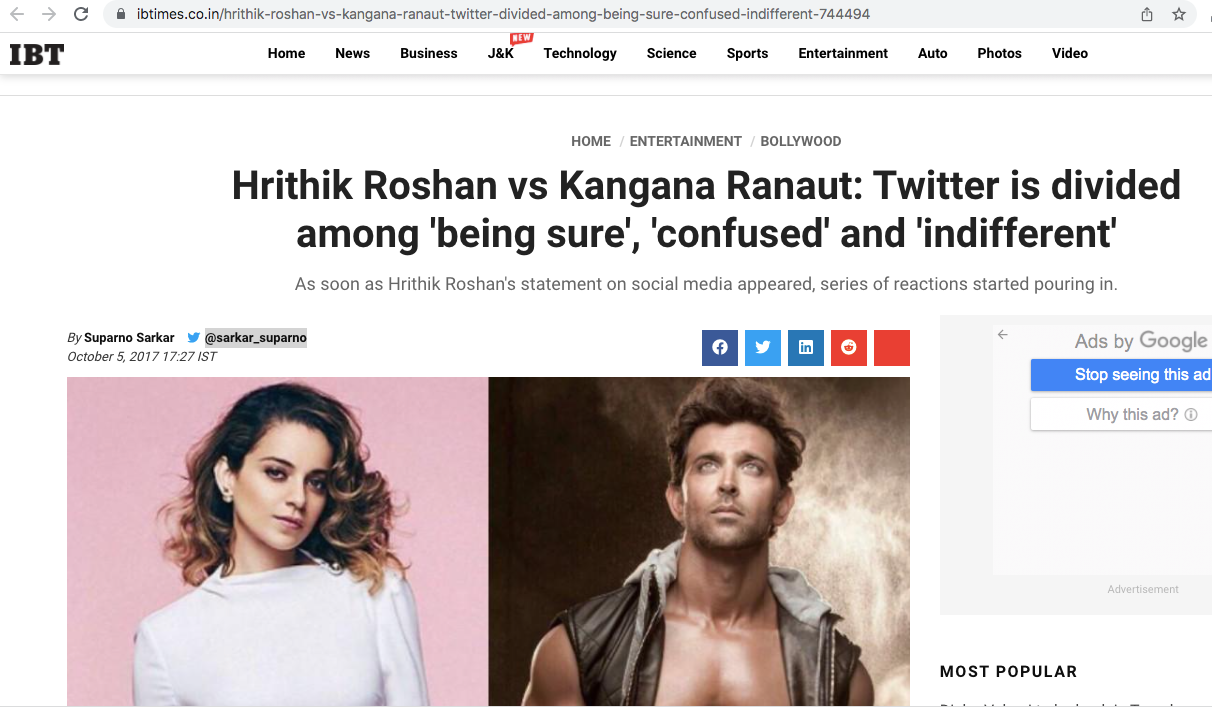 My tweet on the Hrithik Roshan – Kangana Ranaut controversy was featured in the International Business Times Times of India, a leading American online news publication alongside Rajeev Masand, Celebrity Journalist and Film Critic, and Deepika Bharadwaj, journalist, documentary filmmaker, and men’s rights activist.