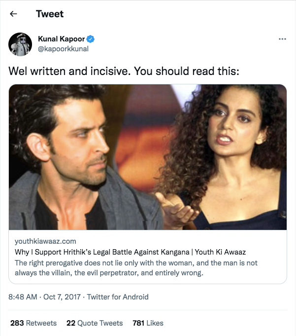 My YouthKiAwaaz article on the Hrithik Roshan – Kangana Ranaut controversy was appreciated and shared by Kunal Kapoor, Indian actor, producer, writer, and entrepreneur, on his Twitter handle.